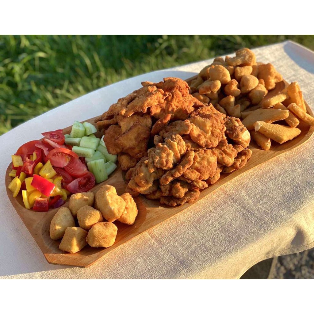 Kuřecí řízečky 1kg, vepřové řízečky 1kg, smažený květák 1kg, smažený hermelín 500g, dip 2ks, chléb 1ks