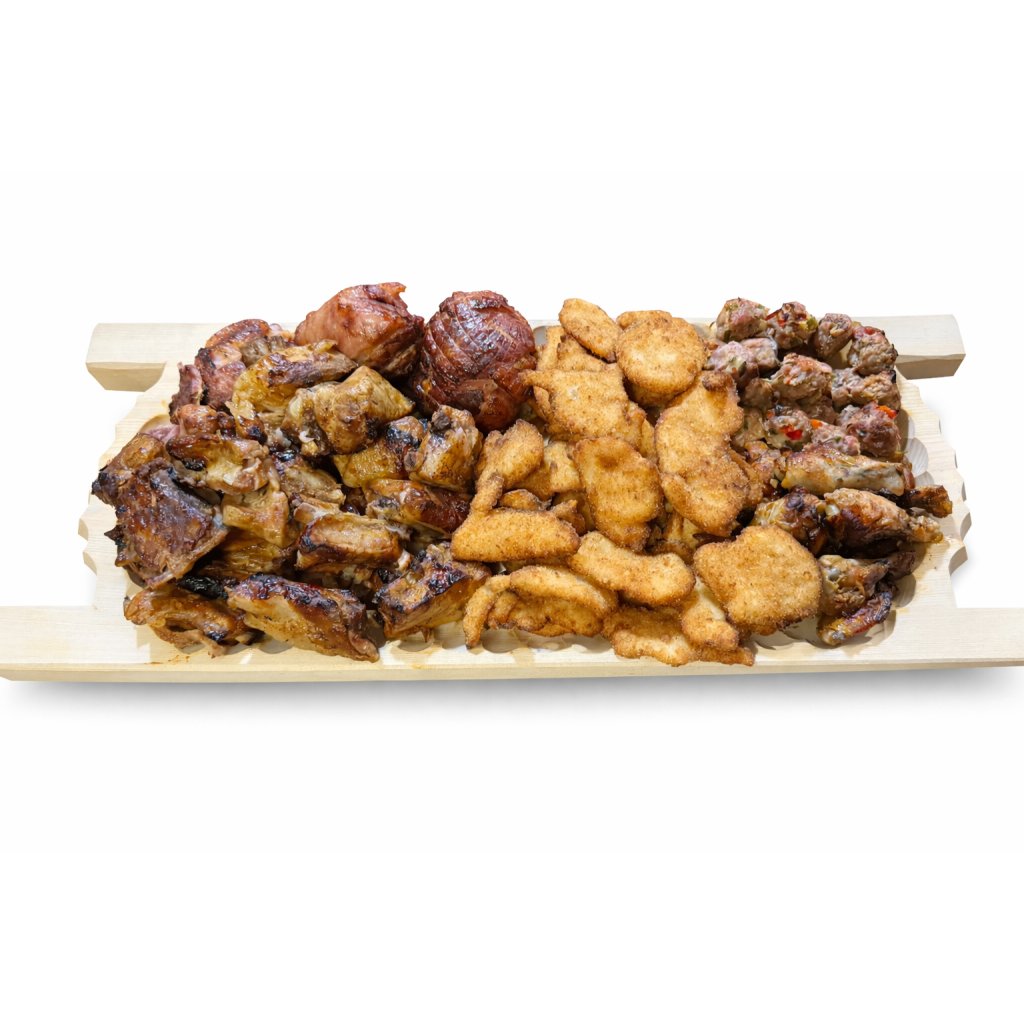 Pečená žebra 2kg, uzené koleno 4ks, kuřecí křídla 500g, kuřecí řízečky 1kg, mini karbanátky 500g, kyselé okurky, dip 2ks, chléb 1ks