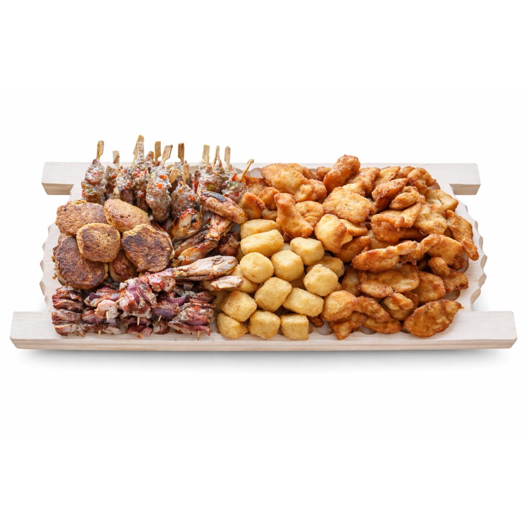 Kuřecí řízečky 1kg, vepřové řízečky 1kg, kuřecí kari placičky 500g, šašlík na špejli 500g, kuřecí křídla 500g, smažený hermelín 500g, dip 2ks, chléb 1ks